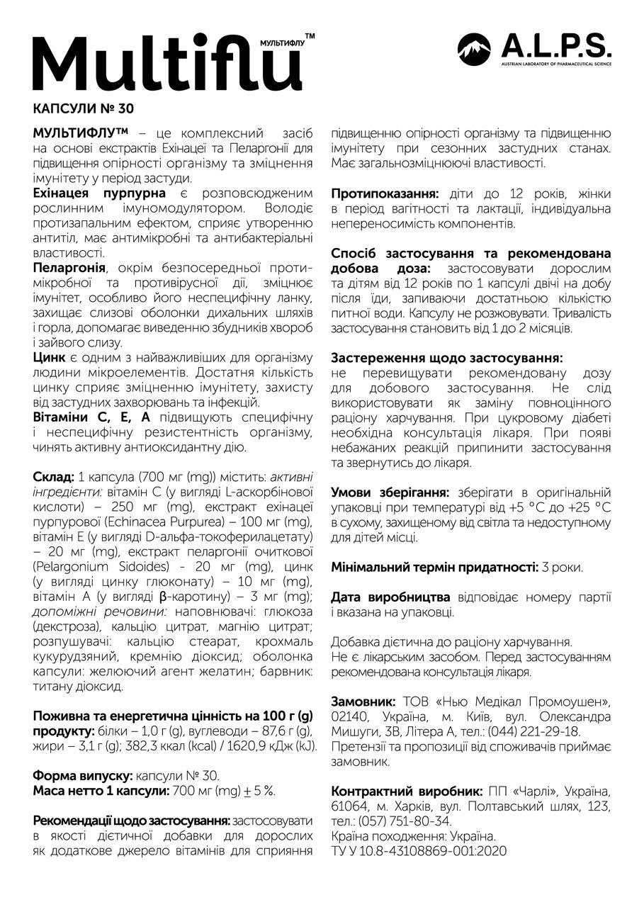 MULTIFLU™ – це натуральний комплексний засіб для сприяння та підтримання імунітету на основі екстрактів Ехінацеї та Пеларгоні. Застосовується для підвищення опірності організму та зміцнення імунітету при сезонних застудних станах.